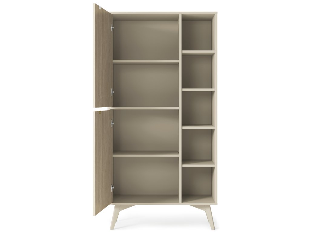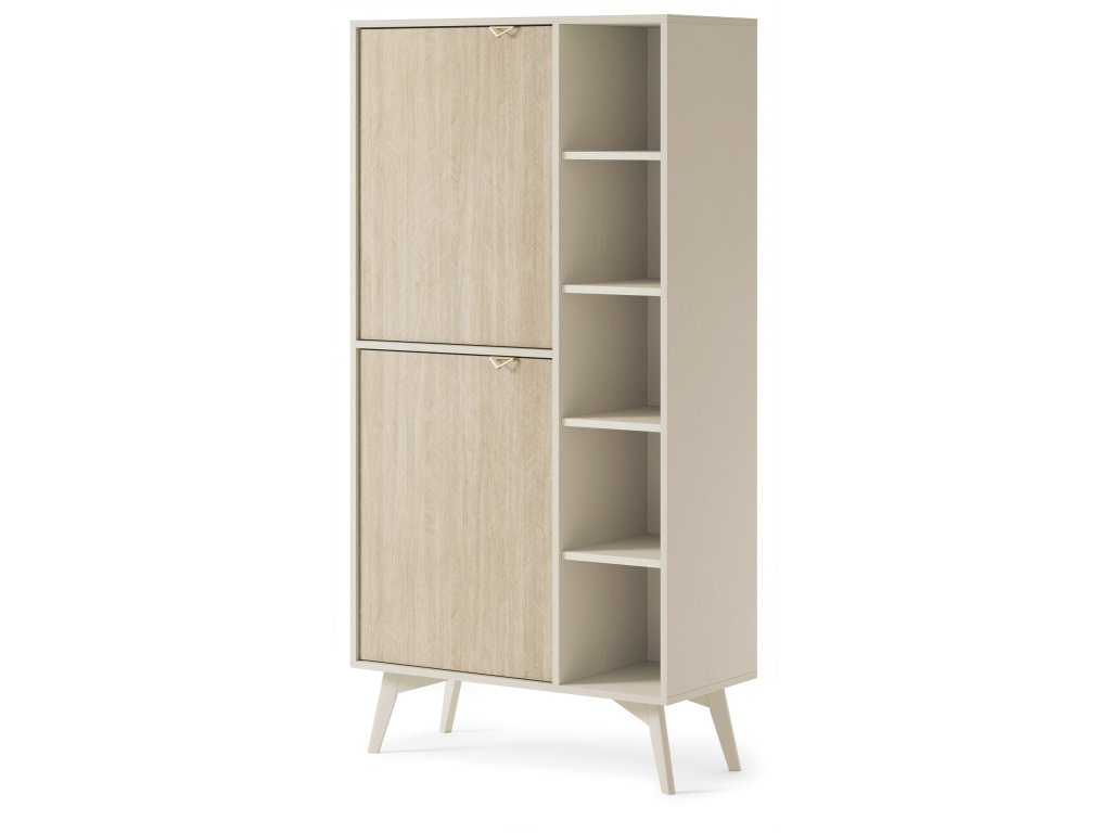 Regál Forest RG80 přináší velkorysý úložný prostor v podobě čtyř otevřených a tří vnitřních polic, díky čemuž se stane skvělým pomocníkem v obývacím pokoji, pracovně či ložnici. Jeho design čerpá inspiraci ze skandinávské jednoduchosti, kterou doplňuje dekor rybí kosti a decentní zlaté kovové úchytky.